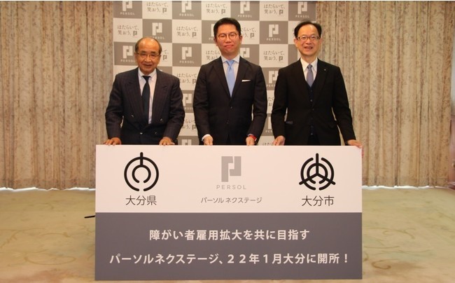 2021年12月1日に行われた、パーソルネクステージ大分立地表明式の様子(左から大分県の広瀬 勝貞知事、吉岡、大分市の佐藤 樹一郎市長)